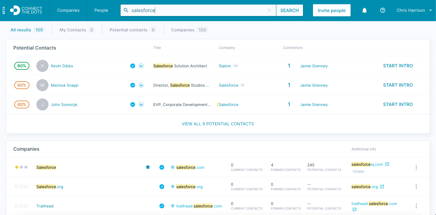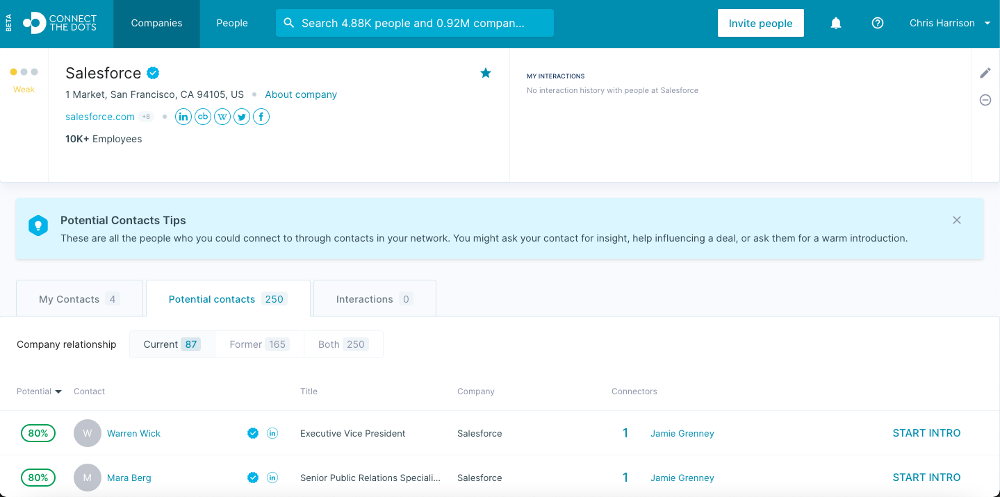 You can then click on the company to view a more in depth report on how you can find an "in" there. You will be able to see your interactions with the company, contacts who are current and former employees there, and any potential contacts you may have.