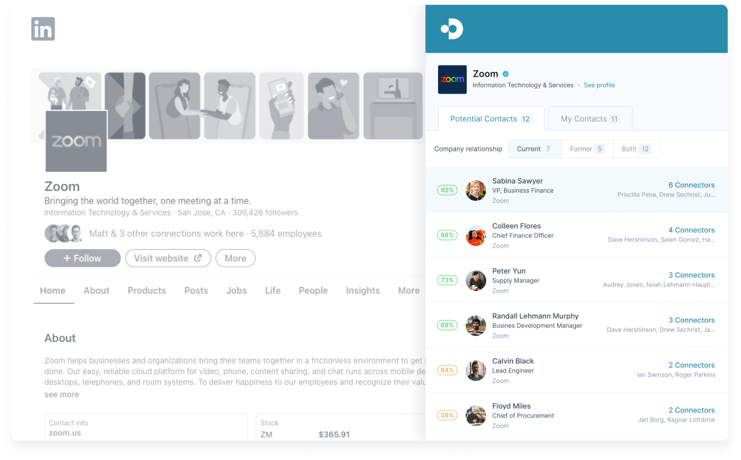 When you are searching for a company on LinkedIn or looking a person's profile page, you'll see the Connect The Dots logo floating there on the right side. When you click on it you'll see all the contacts surfaced from your email accounts, as well as all your potential contacts sorted by relationship strength. Give it a try and let us know what you think!