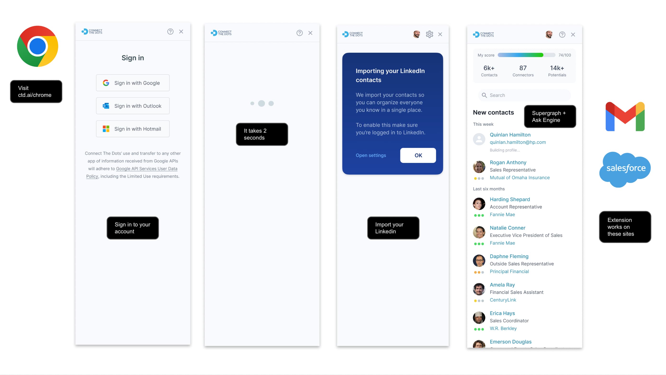 Adding your LinkedIn contacts is an important step toward maximizing the size of your usable network. The larger your network, the greater the chance you'll find connections to new prospects. We talk about building your Supergraph. When have you ever had all of your contacts organized, and automatically deduplicated, in one place? We do it for you in a few clicks.